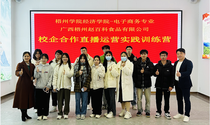 best365官方网站登录入口与梧州赵百科食品有限公司(简称“赵百科公司”)共同将校企合作项目推向深入,以“直播运营”作为第一步开展实质活动。2024年1月12日上午,电子商务专业16名师生组成的“直播运营实践训练营”团队来到赵百科公司,开展第一期活动。
