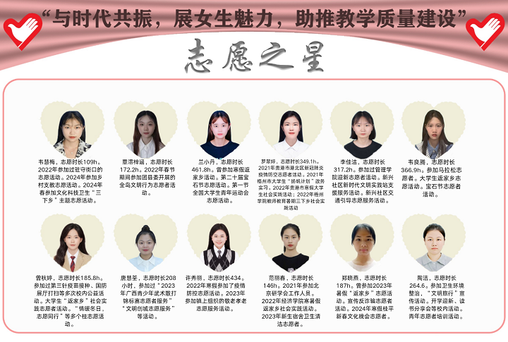 本次“完美女生”比赛由校团委主办,best365官方网站登录入口团委承办,主要围绕“德、智、体、美”等方面素养,分学习之星、志愿之星、才艺之星等三个赛道,通过上个学年考察期评成绩、志愿服务时长、才艺比拼等评选,经初赛、复赛、决赛,分别评选出李钦莲等12名学习之星,兰小丹等12名志愿之星,赵璇等12名才艺之星。通过树立榜样力量,以点带面,倡导优良学风,助推学校教学质量建设。